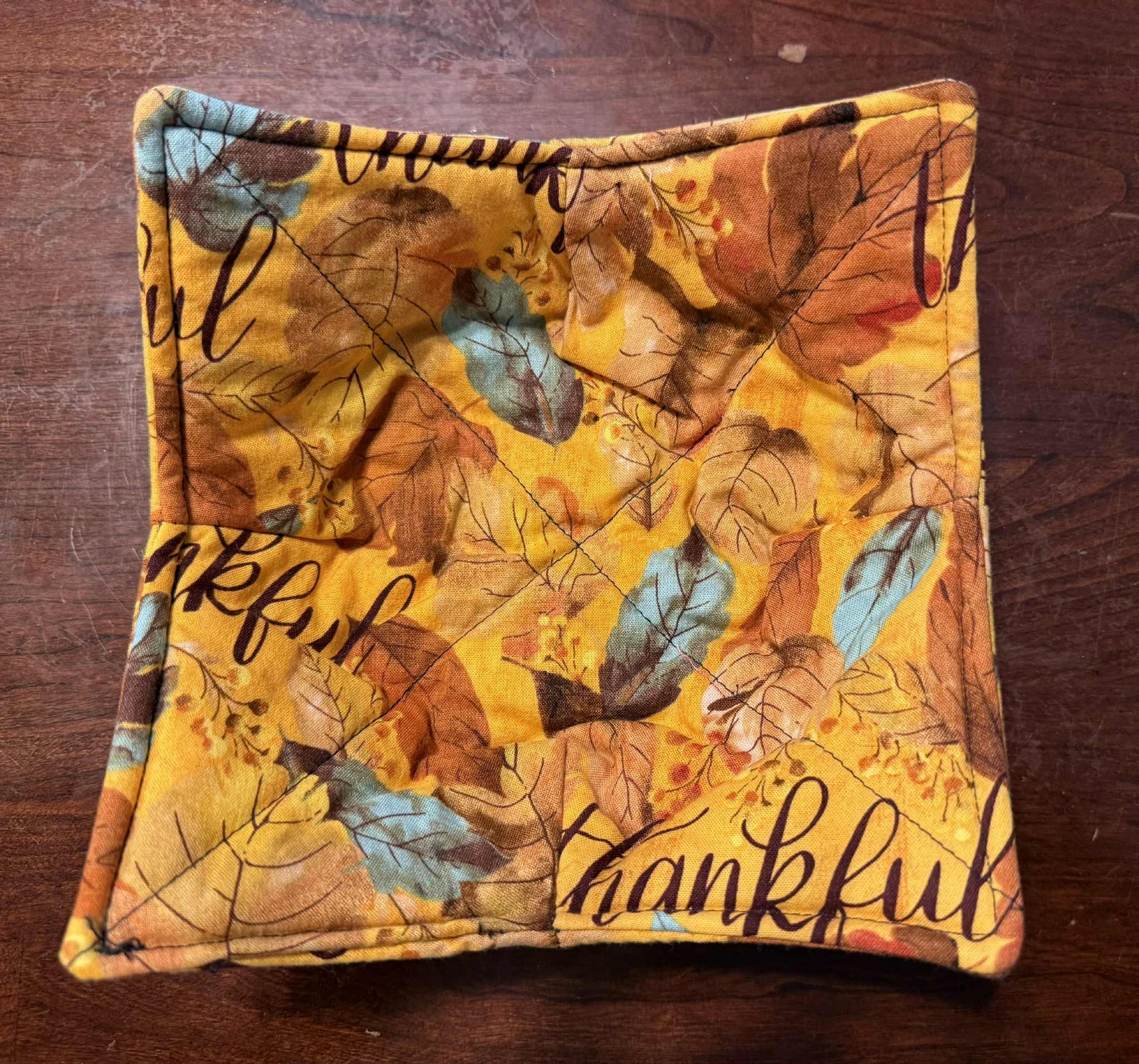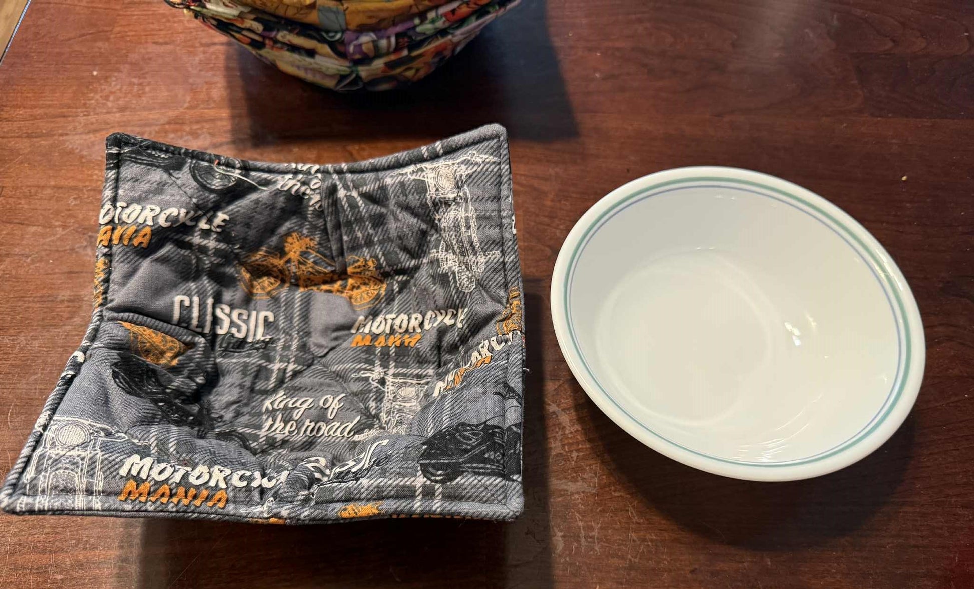Stylish and practical our bowl cozies are made with 100% cotton making them safe for warming food in the microwave. No more burnt finger on that oatmeal or soup you are heating up. Bowl cozies protect your hands and furniture from heat. Simply place your glass bowl of whatever you are warming into your bowl cozy and warm in the microwave for up to 2 minutes at a time. Stir and set it a bit longer if needed.